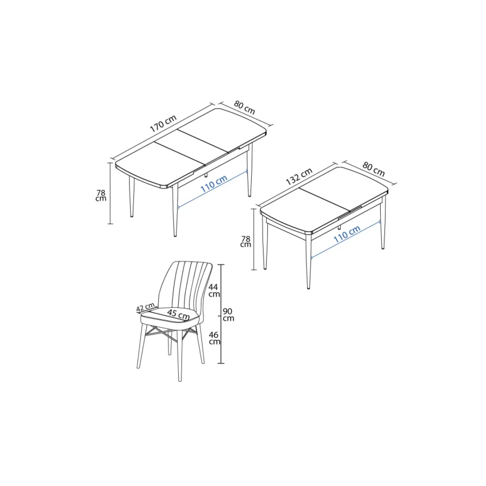 • Matmenys (ilgis/aukštis/gylis): stalo :132-170/78/80 cm,  kėdės: 45/46-90/42 cm.